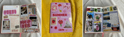 Cette année, j’ai décidé de capturer toutes mes inspirations estivales dans des pages de journaling créatif, en mélangeant collages, citations, dessins et souvenirs.